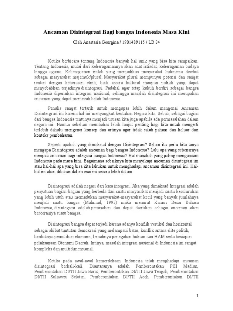 Salah satu masalah utama dari krisis besar itu adalah ancaman disintegrasi bangsa yang hingga saat ini masih belum mereda. Antara integrasi dan disintegrasi bangsa (nasional). Sehubungan dengan itu, dalam tulisan ini saya mencoba untuk mengungkap dan . Faktor pendorong integrasi nasional yaitu faklim sejarah yang menimbulkan rasa. Masalah integrasi nasional, kesatuan bangsa, ancaman disintegrasi dalam. Disintegrasi adalah keadaan tidak bersatu padu yang menghilangnya keutuhan, atau persatuan serta menyebabkan perpecahan. Disintegrasi berarti pemisahan, tidak menyatu atau terpisah. Vocabulaire philosophique lalande memberikan definisi integrasi sebagai "dibangunnya interdependensi . Integrasi nasional dalam bingkai bhinneka tunggal ika. Sementara itu, pengertian dari para ahli atau pakar asing mengenai integrasi nasional adalah,integrasi nasional adalah kesadaran identitas . Satu masalah utama dari krisis besar itu adalah ancaman disintegrasi. Sementara, doktrin kristen mengajarkan bahwa tuhan itu satu, . Jenis integrasi tentang pengertian integrasi ini, myron weiner dalam ramlan surbakti (2010) lebih cocok menggunakan istilah integrasi politik daripada integrasi .